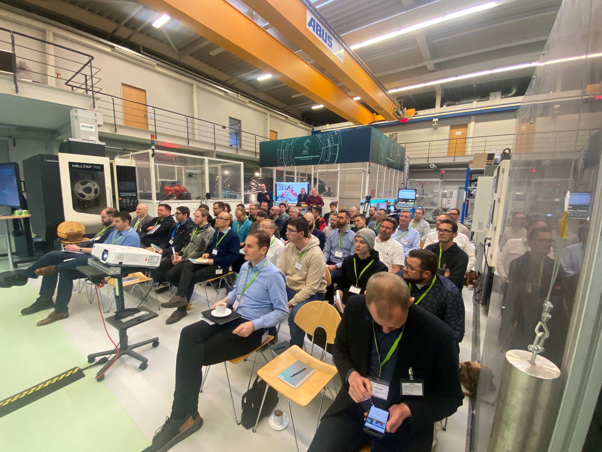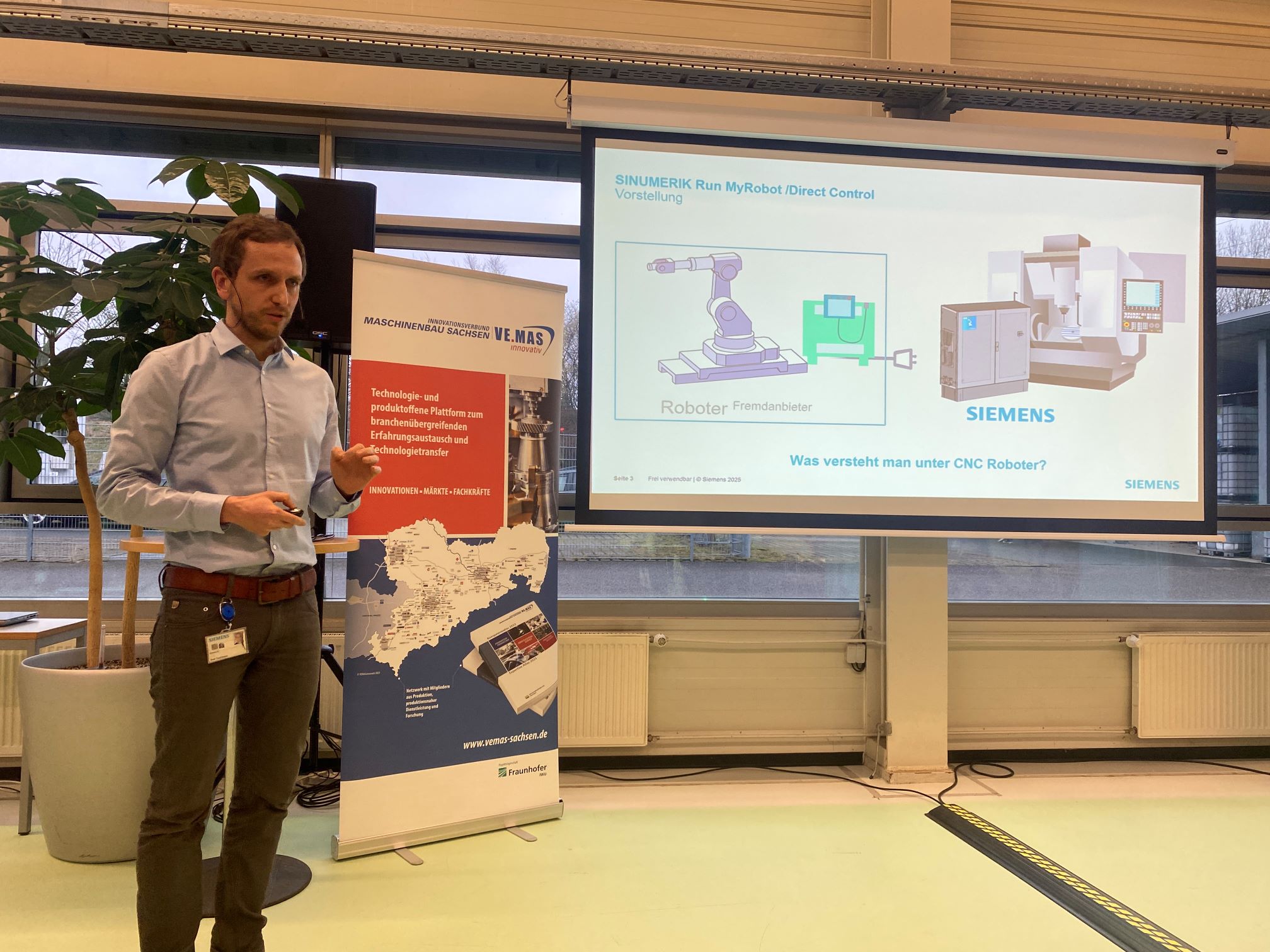 Die Initiative "Robotik SACHSEN!" bot mit dem Format "Robotik erleben" am vergangenen Donnerstag einen umfassenden Einblick in das CoC CenterOfCompetence Robotic der SIEMENS AG in Chemnitz. Im konzernweiten Applikations- und Testzentrum für Robotikanwendungen wurden den 50 Teilnehmenden direkt in der Versuchshalle neueste Roboter-Steuerungsmöglichkeiten vorgestellt. Es wurde aufgezeigt, wie vorhandene Maschinen, Roboter und Logistiksysteme in eine einheitliche System- und Steuerungswelt integriert werden können und damit die Nutzung der Robotik in bestehenden Fertigungen aufwandsarm möglich ist. Ein besonderes Highlight war die Vorstellung der weltweit neuen MTR "Machine Tool Robot" Regelungsfunktion in der SINUMERIK/Run MyRobot/Direkt Control Steuerung, die eine wesentlich höhere Genauigkeit für die mechanische Bearbeitung von Bauteilen mittels Roboter bietet. Im Anschluss an die Vorträge nutzten die Teilnehmenden die Möglichkeit, sich anhand von Live-Demonstrationen die Robotik-Lösungen anzuschauen und in den fachlichen Austausch zu treten.