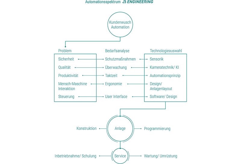JB Engineering ist Ihr verlässlicher Partner für Konstruktion und Automation, angefangen bei der Produktentwicklung bis hin zur vollständig automatisierten Produktionsanlage. Kunden profitieren von unserer branchenübergreifenden Erfahrung — von der Lebensmittelindustrie über Halbleiterfertigung bis in den Betriebsmittelbau für Roboterschweißanlagen und automatisierte Sondermaschinen. Wir stellen uns flexibel auf die Bedürfnisse des Kunden ein und erweitern als Konstruktionsdienstleister dessen Projektressourcen, erstellen abhängig von der Anfrage Konzepte, Prototypen und komplexe Anlagen. Wir machen agiles Engineering. Was bedeutet, wir nutzen Design Thinking und 3D Druck, um Entwicklungsprozesse zu parallelisieren und somit zu beschleunigen. Kunden nutzen unser effizientes Lean-Management, um ihre Wettbewerbsfähigkeit zu steigern.