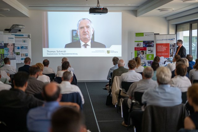 Die Veranstaltung begann mit einer Eröffnung durch den Bündniskoordinator von WIR! sind DIANA, Dr. Dirk Kuhlmeier, vom Fraunhofer IZI & Dr. Uwe Lienig, von der Wirtschaftsförderung Sachsen GmbH, gefolgt von einem Video-Grußwort des Staatsministers für Regionalentwicklung, Thomas Schmidt. An dieser Stelle ein herzliches Dankeschön dafür.