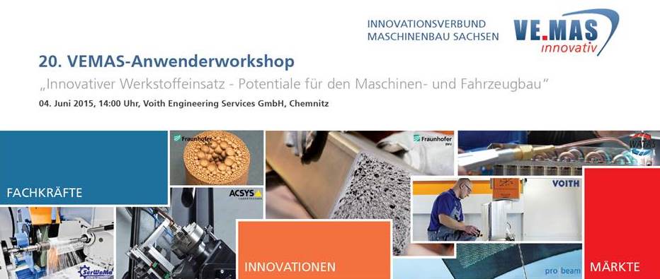 VEMASinnovativ veranstaltet am 04. Juni 2015 in Kooperation mit dem Netzwerk „Zellulare Metallische Werkstoffe“ und in Zusammenarbeit mit der Wirtschaftsförderung Sachsen GmbH den 20. VEMAS-Anwenderworkshop zum Thema „Innovativer Werkstoffeinsatz - Potentiale für den Maschinen- und Fahrzeugbau“ bei der Voith Engineering Services GmbH in Chemnitz.