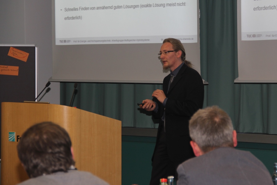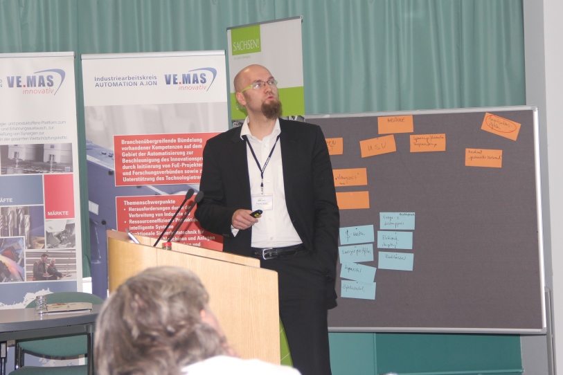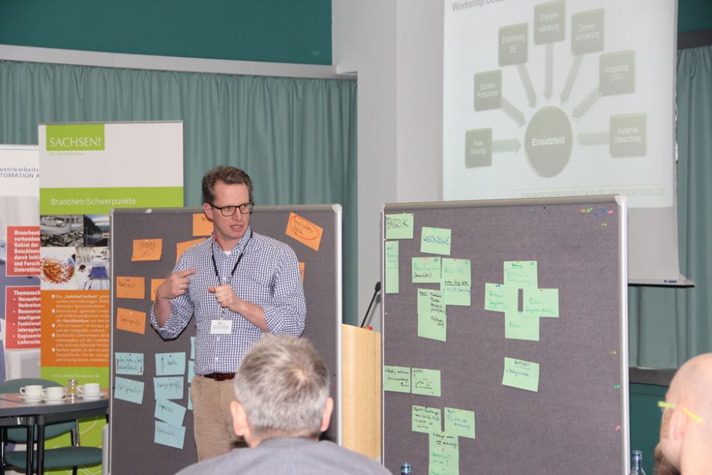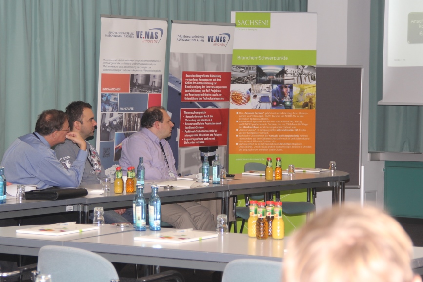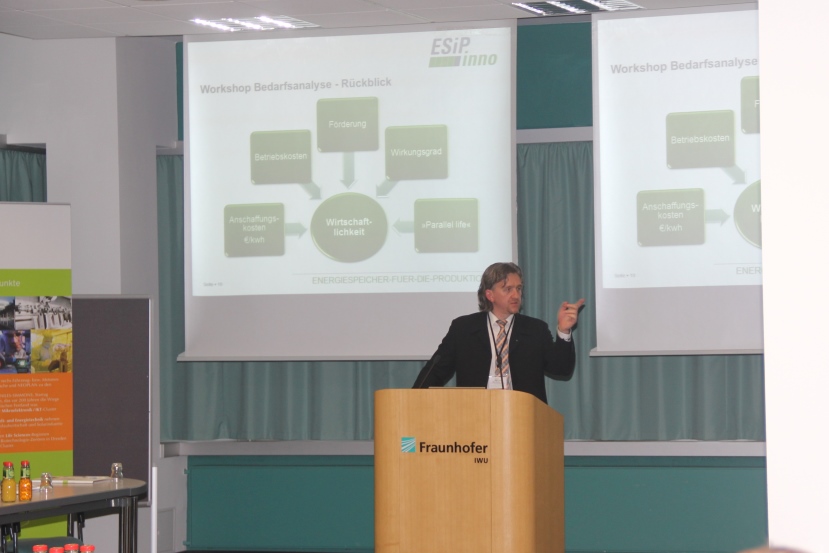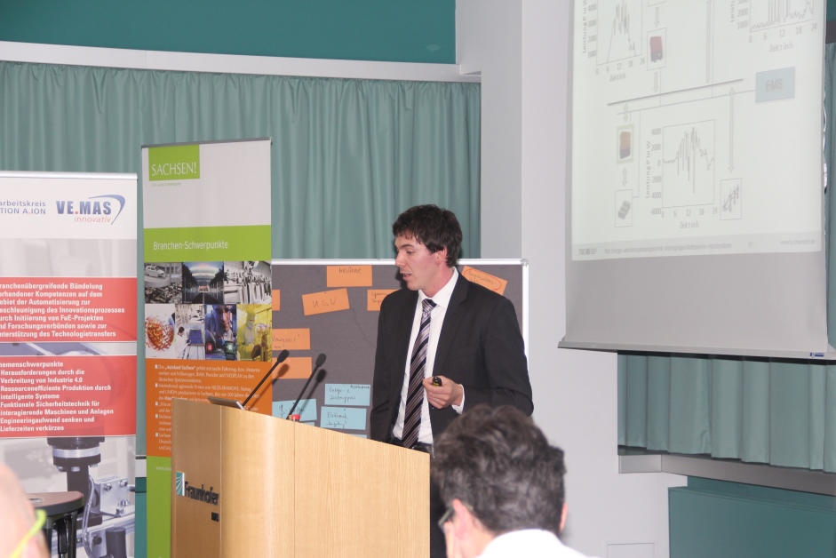 Im Rahmen des Innovationsforums ESiPinno fand neben der Kick-off-Veranstaltung mit 100 Teilnehmern nun bereits der zweite Workshop mit über 40 Teilnehmern, welcher zugleich der 19. VEMAS-Anwenderworkshop war, zum Thema "Auslegungs- werkzeuge, Hardware und Informationstechnische Vernetzung für innovative Energiespeicherkonzepte für die industrielle Produktion" am Fraunhofer-Institut für Werkzeugmaschinen und Umformtechnik IWU, Chemnitz statt. Während der Diskussions- runde wurden die Themenschwerpunkte Planungs- und Auslegungswerkzeuge in der Fabrik- und Elektroplanung; Erforderliche Eingangsgrößen und Kriterien der Fabrik- und Elektroplanung; Simulation & Betriebsführung von Speichersystemen sowie die informationstechnische Vernetzung von Speichersystemen und ihrer Umgebung aufgegriffen.
