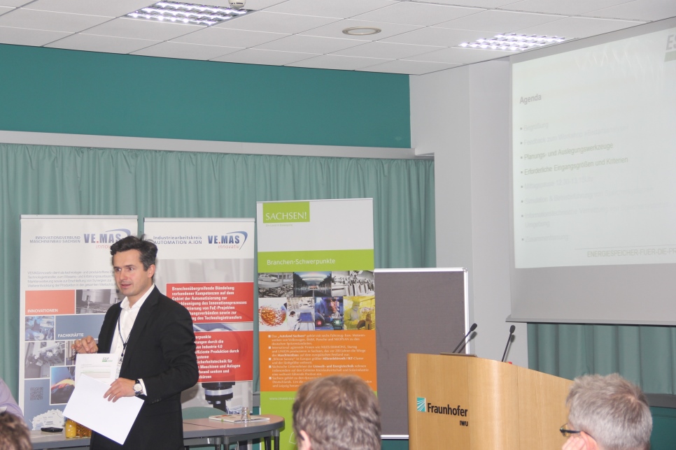In Fortsetzung der Kick-off-Veranstaltung am 23.10.2014 an der Technischen Universität Chemnitz und des 18. VEMAS-Anwenderworkshops "Anforderungsbilder zur Entwicklung innovativer Energiespeicherkonzepte für die industrielle Produktion" am Fraunhofer IWU Chemnitz, wird im Rahmen des 19. VEMAS-Anwenderworkshops am 04.12.2014 eine Diskussionsrunde zu dem Thema "Auslegungswerkzeuge, Hardware und Informationstechnische Vernetzung für innovative Energiespeicherkonzepte für die industrielle Produktion"  am Fraunhofer-Institut für Werkzeugmaschinen und Umformtechnik IWU, Chemnitz durchgeführt. Der Workshop wird im Rahmen des Innovationsforums "Innovative Energiespeicherkonzepte für die industrielle Produktion" duruchgeführt. Die Veranstaltung findet mit Unterstützung der Wirtschaftsförderung Sachsen statt.