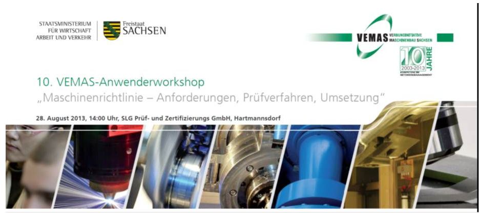 Am 28.08.2013 findet ab 14:00 Uhr der 10. VEMAS-Anwenderworkshop zum Thema "Maschinenrichtlinie - Anforderungen, Prüfverfahren, Umsetzung" in Kooperation mit der IHK Chemnitz, dem Enterprise Europe Network und mit Unterstützung der Wirtschaftsförderung Sachsen GmbH bei der SLG Prüf- und Zertifizierungs GmbH in Hartmannsdorf statt.
