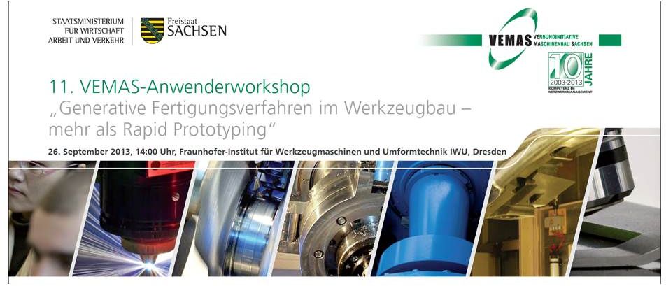 Am 26.09.2013 findet der 11. VEMAS-Anwenderworkshop zum Thema " Generative Fertigungsverfahren im Werkzeugbau - mehr als Rapid Prototyping" in den Räumlichkeiten des Fraunhofer-Instituts für Werkzeugmaschinen und Umformtechnik IWU in Dresden statt.